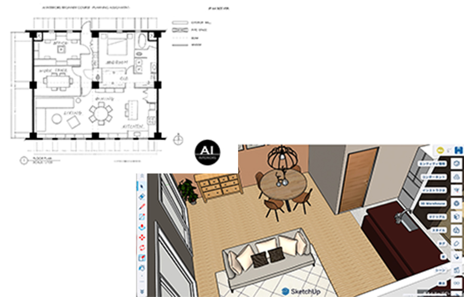 動線や機能を検討した上で、平面図と3Dパース(sketch up)を作成します。